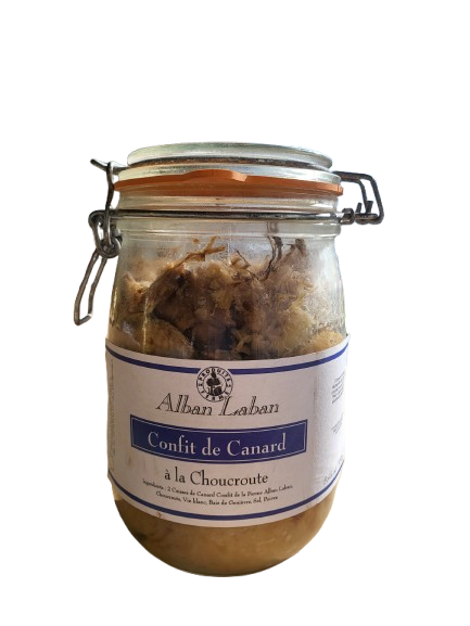 Confit de canard de la ferme Alban Laban, choucroute, vin blanc, épices, sel, poivre